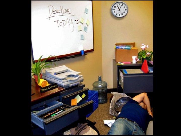 Answer each question below. 1. What color coffee mug was in the picture? 2. When was the deadline? Yesterday Blue Red Today 3. What time was on the clock on the wall? Tomorrow 10: 40 11: 05 4. How many sticky notes were on the whiteboard? Four 5. Which of the following was NOT in the picture? Stapler 6. What was the name on the plaque on the desk? Bill 7. What color was the victim's shirt? Black 8. How many plants were in the picture? None Blue On a box Source: http: //forensics. rice. edu/html/picture_begin. html 1: 55 Six Eight Trash Can Brian Printer Carl Red One 9. What was the color of the marker in the desk drawer? 10. Where was the book in the picture? Yellow Two Red In the trash can Blue Green Under the body