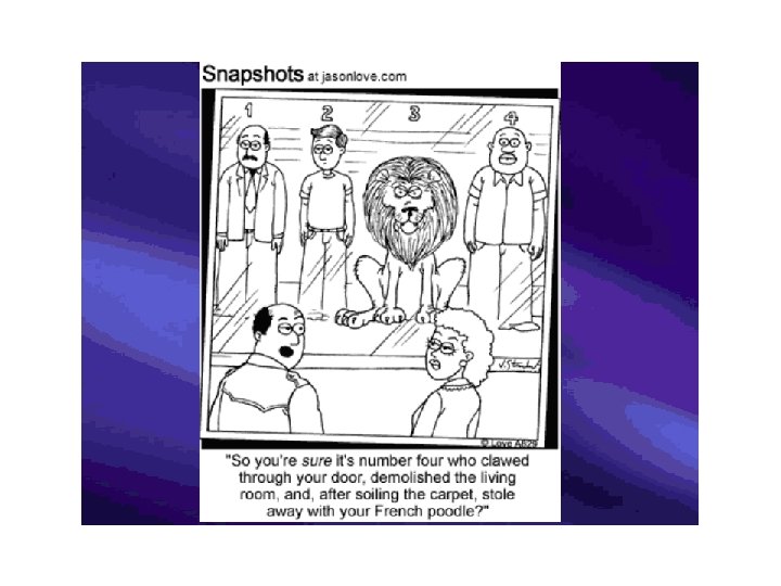 • A police lineup or identity parade is a process by which a crime victim or witness's identification of a suspect is confirmed to a level that can count as evidence at trial. • The suspect, along with several "fillers" or "foils"—people of similar height, build, and complexion who may be prisoners, actors or volunteers—stand side-by-side, both facing and in profile. • The lineup sometimes takes place in a room with a one-way mirror to allow a witness to remain anonymous, and may include markings on the wall to aid identifying the person's height. • For evidence from a lineup to be admissible in court, the lineup itself must be conducted fairly. The police may not say or do anything that persuades the witness to identify the suspect that they prefer. Police Lineup • . Why do you think this lineup may be inappropriate?