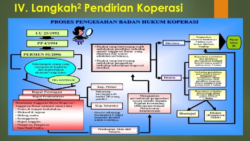 3. Atas dasar permohonan tsb pejabat dinas koperasi memberikan penyuluhan tentang pengertian koperasi, tujuan dan manfaat berkoperasi, hak dan kewajiban anggota dan peraturan lainnya. 4. Persiapan dan rapat pembentukan koperasi minimal dihadiri 20 orang calon anggota koperasi, yang dipimpin oleh pemerkasa dengan materi: kesepakatan pembentukan, pembahasan AD/ART, penetapan pendirian koperasi, pemilihan pengurus dan pengawas koperasi serta sumpah dan janji pengurus dan pengawas. 5. Sejak rapat pembentukan tersebut, koperasi telah dapat menjalankan aktivitas usahanya al: anggota membayar simpanan pokok, simpanan wajib dan simpanan lainnya. 6. Pengurus mengajukan permohonan status badan hukum ke kantor Dinas koperasi setempat. 7. Pejabat kantor Koperasi melakukan verifikasi dan penelitian atas kebenaran data-data yang diajukan.