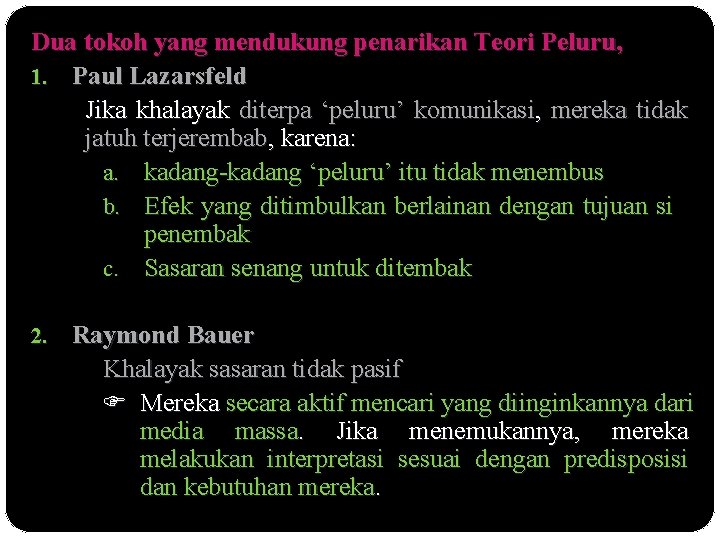 Dua tokoh yang mendukung penarikan Teori Peluru, 1. Paul Lazarsfeld Jika khalayak diterpa ‘peluru’ komunikasi, mereka tidak jatuh terjerembab, karena: a. kadang-kadang ‘peluru’ itu tidak menembus b. Efek yang ditimbulkan berlainan dengan tujuan si penembak c. Sasaran senang untuk ditembak 2. Raymond Bauer Khalayak sasaran tidak pasif Mereka secara aktif mencari yang diinginkannya dari media massa. Jika menemukannya, mereka melakukan interpretasi sesuai dengan predisposisi dan kebutuhan mereka.