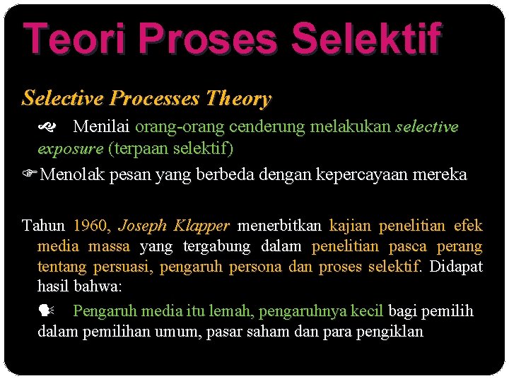 Teori Proses Selektif Selective Processes Theory Menilai orang-orang cenderung melakukan selective exposure (terpaan selektif) Menolak pesan yang berbeda dengan kepercayaan mereka Tahun 1960, Joseph Klapper menerbitkan kajian penelitian efek media massa yang tergabung dalam penelitian pasca perang tentang persuasi, pengaruh persona dan proses selektif. Didapat hasil bahwa: Pengaruh media itu lemah, pengaruhnya kecil bagi pemilih dalam pemilihan umum, pasar saham dan para pengiklan