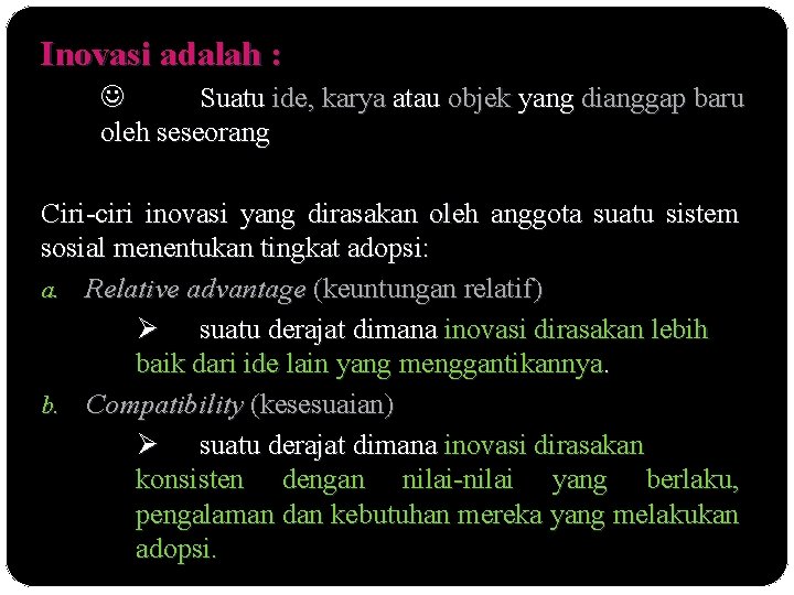 Inovasi adalah : Suatu ide, karya atau objek yang dianggap baru oleh seseorang Ciri-ciri inovasi yang dirasakan oleh anggota suatu sistem sosial menentukan tingkat adopsi: a. Relative advantage (keuntungan relatif) suatu derajat dimana inovasi dirasakan lebih baik dari ide lain yang menggantikannya. b. Compatibility (kesesuaian) suatu derajat dimana inovasi dirasakan konsisten dengan nilai-nilai yang berlaku, pengalaman dan kebutuhan mereka yang melakukan adopsi.