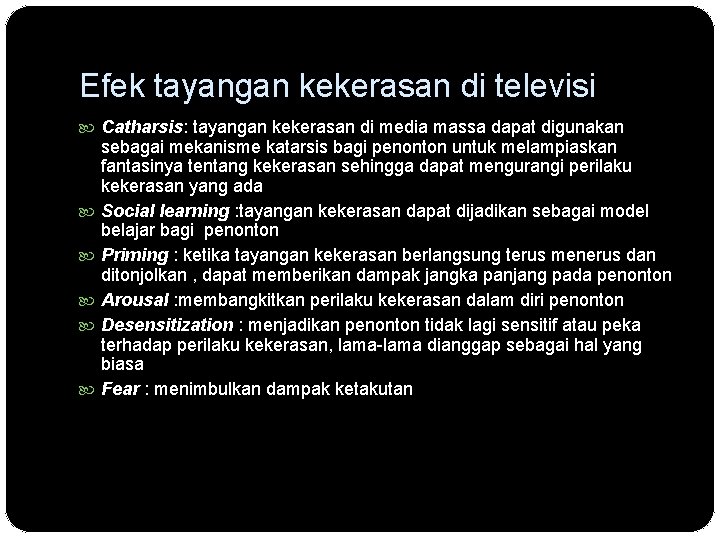 Efek tayangan kekerasan di televisi Catharsis: tayangan kekerasan di media massa dapat digunakan sebagai mekanisme katarsis bagi penonton untuk melampiaskan fantasinya tentang kekerasan sehingga dapat mengurangi perilaku kekerasan yang ada Social learning : tayangan kekerasan dapat dijadikan sebagai model belajar bagi penonton Priming : ketika tayangan kekerasan berlangsung terus menerus dan ditonjolkan , dapat memberikan dampak jangka panjang pada penonton Arousal : membangkitkan perilaku kekerasan dalam diri penonton Desensitization : menjadikan penonton tidak lagi sensitif atau peka terhadap perilaku kekerasan, lama-lama dianggap sebagai hal yang biasa Fear : menimbulkan dampak ketakutan