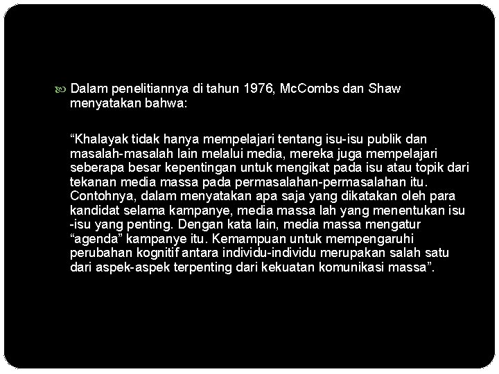 Dalam penelitiannya di tahun 1976, Mc. Combs dan Shaw menyatakan bahwa: “Khalayak tidak hanya mempelajari tentang isu-isu publik dan masalah-masalah lain melalui media, mereka juga mempelajari seberapa besar kepentingan untuk mengikat pada isu atau topik dari tekanan media massa pada permasalahan-permasalahan itu. Contohnya, dalam menyatakan apa saja yang dikatakan oleh para kandidat selama kampanye, media massa lah yang menentukan isu -isu yang penting. Dengan kata lain, media massa mengatur “agenda” kampanye itu. Kemampuan untuk mempengaruhi perubahan kognitif antara individu-individu merupakan salah satu dari aspek-aspek terpenting dari kekuatan komunikasi massa”.