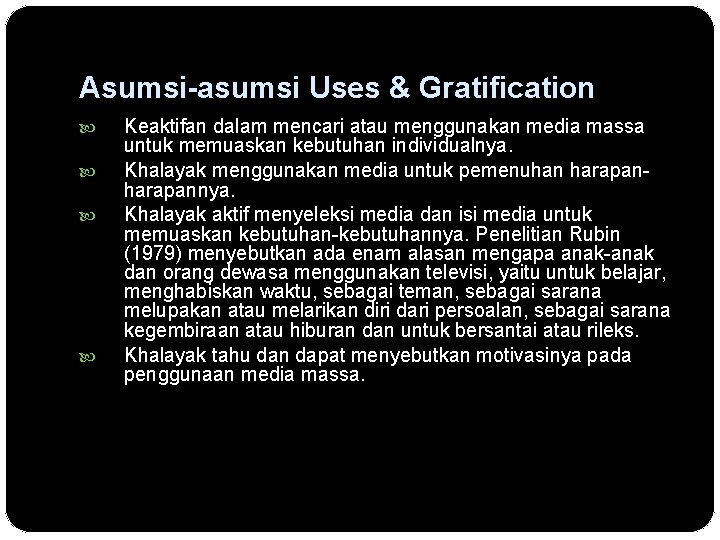 Asumsi-asumsi Uses & Gratification Keaktifan dalam mencari atau menggunakan media massa untuk memuaskan kebutuhan individualnya. Khalayak menggunakan media untuk pemenuhan harapannya. Khalayak aktif menyeleksi media dan isi media untuk memuaskan kebutuhan-kebutuhannya. Penelitian Rubin (1979) menyebutkan ada enam alasan mengapa anak-anak dan orang dewasa menggunakan televisi, yaitu untuk belajar, menghabiskan waktu, sebagai teman, sebagai sarana melupakan atau melarikan diri dari persoalan, sebagai sarana kegembiraan atau hiburan dan untuk bersantai atau rileks. Khalayak tahu dan dapat menyebutkan motivasinya pada penggunaan media massa.