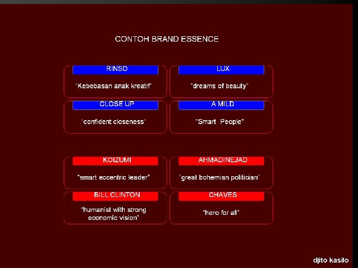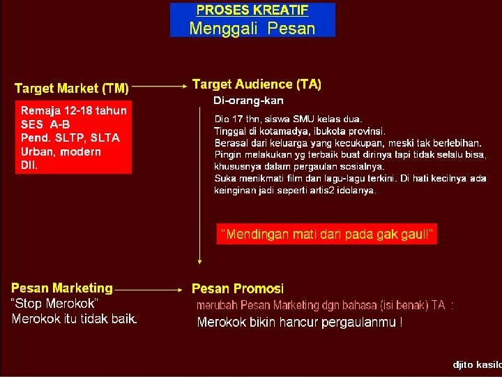 PERSONIFIKASI TARGET AUDIENCE Dio 17 tahun, siswa SMU kelas dua, tinggal di kota, ibukota propinsi, berasal dari keluarga kecukupan, meski tidak berlebihan Pengen melakukan yang terbaik buat dirinya, tapi tidak selalu bisa, khususnya dalam pergaulan sosialnya (“anak gaul”) Suka menikmati film dan lagu-lagu terkini. Di hati kecilnya ada Keinginan jadi seperti artis dst CONSUMER INSIGHT Mendingan Mati daripada “Gak Gaul” FUNGSI Manfaat maupun makna DIFERENSIASI Dibandingkan hal sejenis KEPRIBADIAN Diandaikan sebagai Brand orang Essence OTORITAS/KREDIBILITA S Alasan untuk percaya