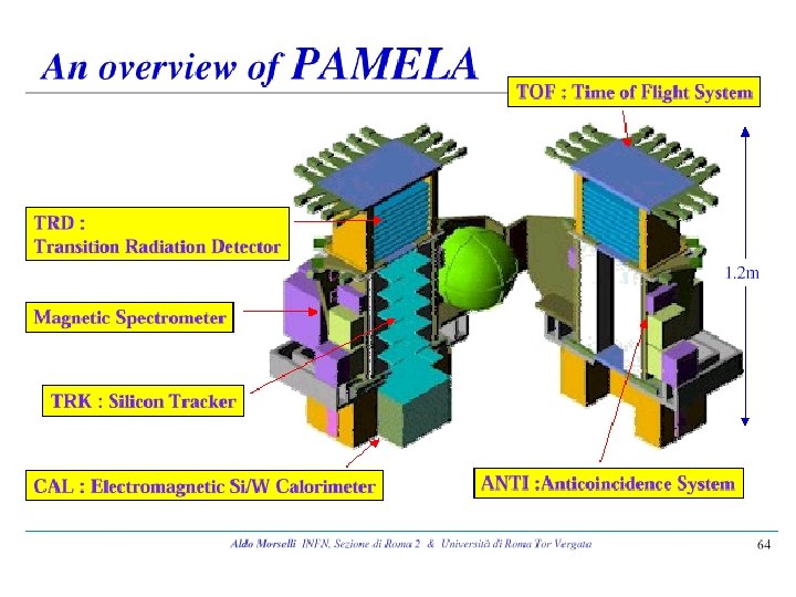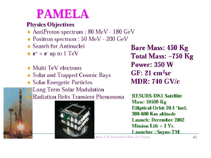 PAMELA, un magnete permanenete attrezzato con diversi rivelatori specializzati: • Spettrometro magnetico • Calorimetro e. m. con strip di silicio • TRD • TOF • Obiettivi di fisica : • raggi cosmici • antimateria • materia oscura PAMELA volerà a bordo del satellite russo Resusrs che verrà lanciato nel dicembre 2002 in un orbita tra 300 e 600 km di altezza,