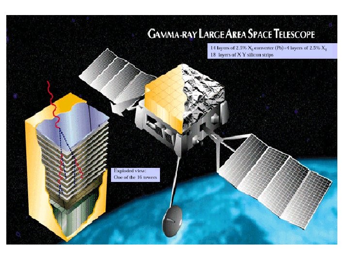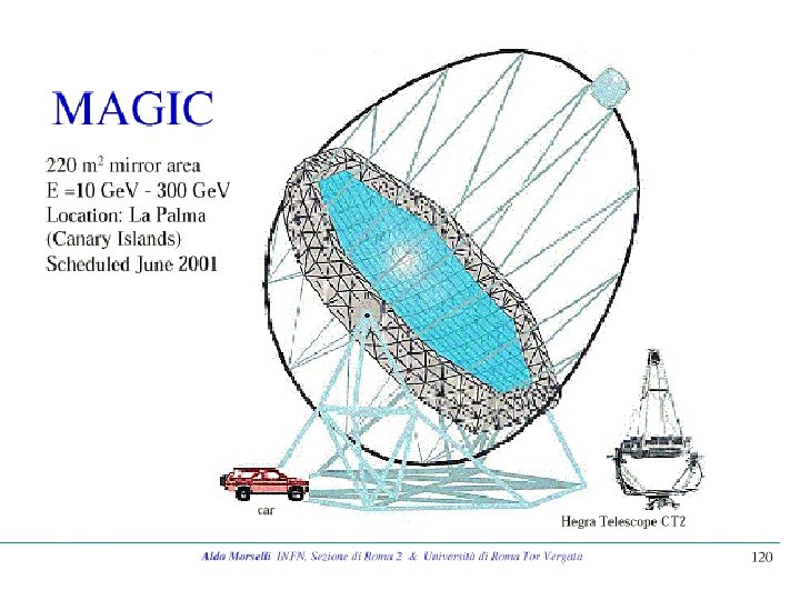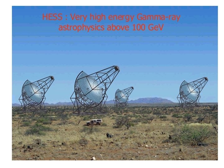 Nuovi rivelatori AIR CERENKOV TELESCOPE • STACEE. USA solar array 70 ->50 Ge. V • CELESTE, Fr solar array 50 -> 25 Ge. V • VERITAS , USA 7 x 10 m 80 Ge. V • MAGIC , Spagna 17 m 30 -15 Ge. V • HESS, Namibia 4 x 12 m 60 Ge. V Ottima separazione h/g, grande area di raccolta luce, bassa soglia.