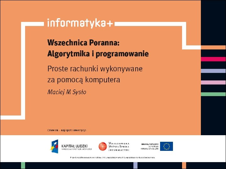 PROSTE RACHUNKI WYKONYWANE ZA POMOCĄ KOMPUTERA WPROWADZENIE DO ALGORYTMIKI Maciej M. Sysło Uniwersytet Wrocławski Uniwersytet UMK w Toruniu syslo@ii. uni. wroc. pl informatyka + 2