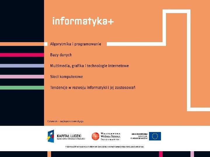 Problemy, algorytmy i ich komputerowe realizacje (implementacje) Plan: • Obliczenia w komputerze – czy komputer może wszystko policzyć? – trasę dla Premiera – kryptogram RSA • Liczby dziesiętne, binarne, … – system pozycyjny, zamiana liczb między systemami • Obliczanie wartości wielomianu – Schemat Hornera • Podnoszenie do potęgi – szybko! • Algorytm Euklidesa – rekurencja, jako przedsmak informatyki informatyka + 8