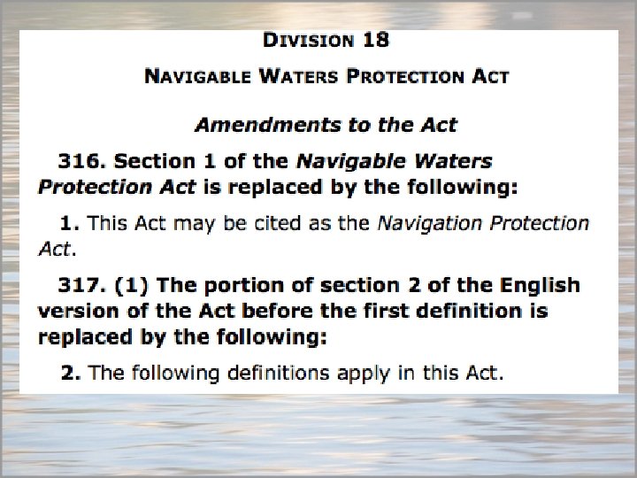 Navigation Protection Act • From Transport Canada’s FAQs • 7. Why is the Government of Canada shifting the responsibility of policing navigation in non-scheduled waterways to the public users (e. g. boaters)? • For centuries boaters and builders have gotten along in shared waterways, generally respectful of each other. In fact, the vast majority of Transport Canada’s Approvals are issued for works that do not substantially interfere with navigation. As such, the Government of Canada has made the decision to focus the department’s resources on the busiest waterways in the country, and allow the common law to be the basis for protecting the public right of navigation.