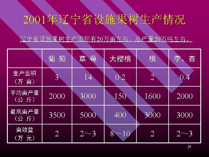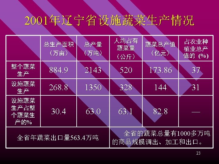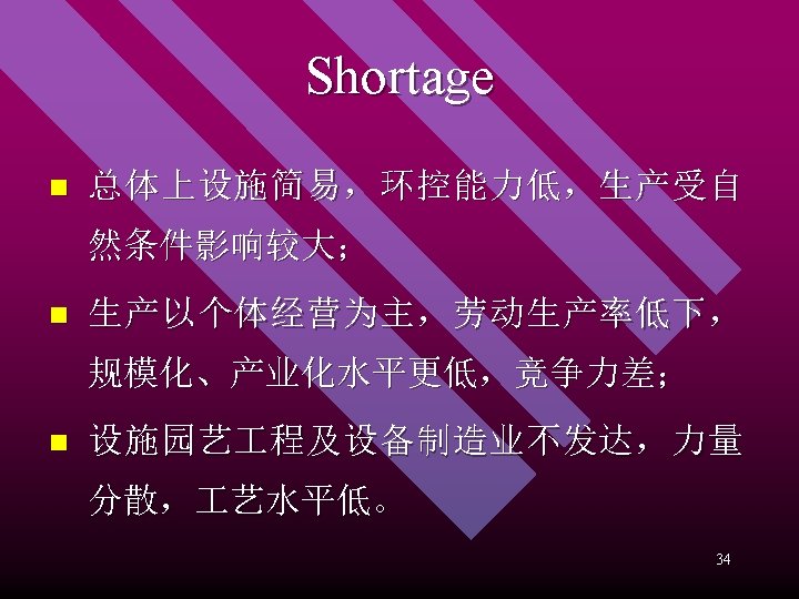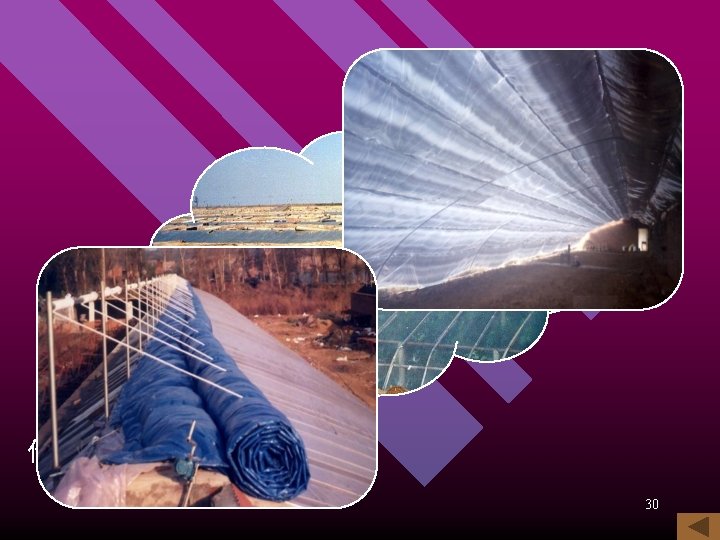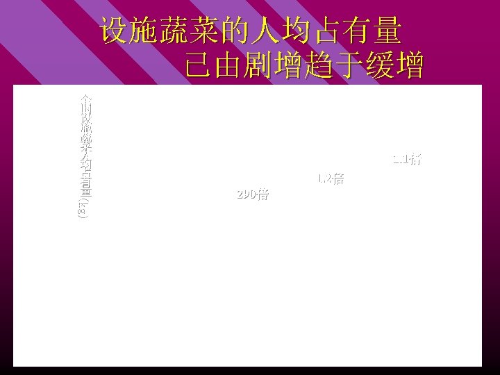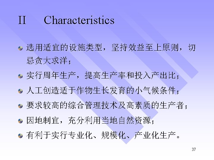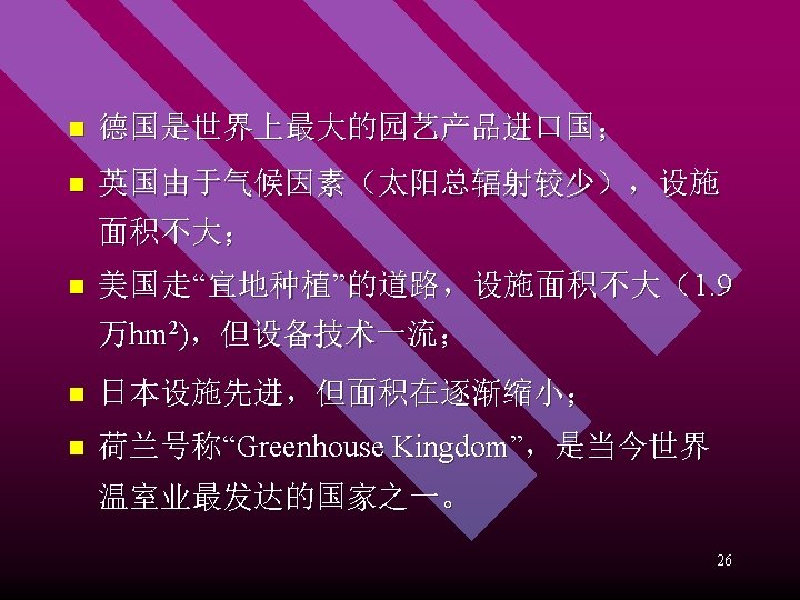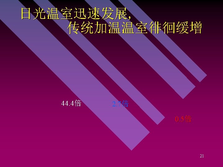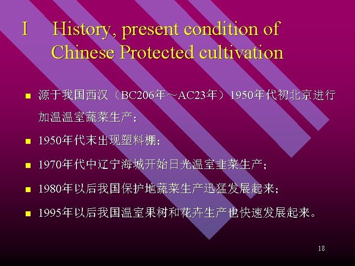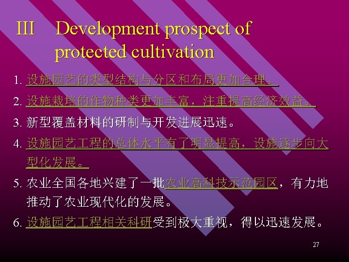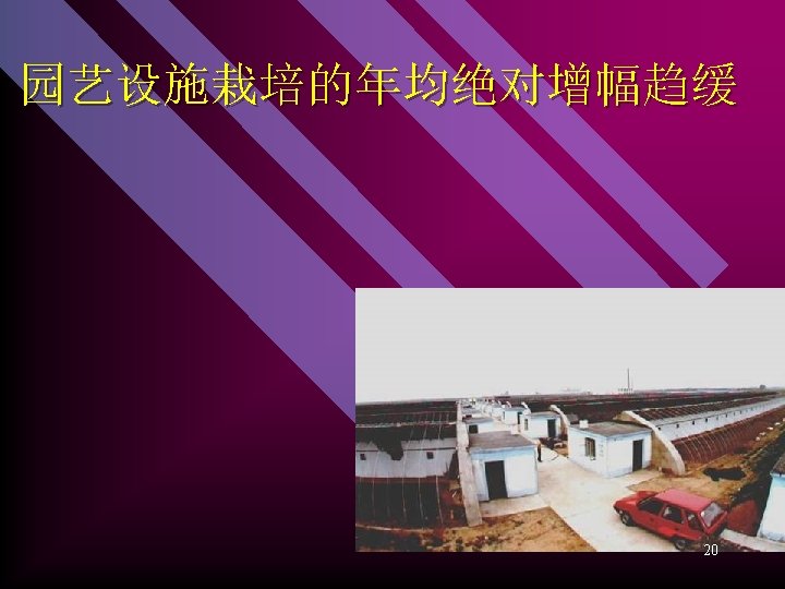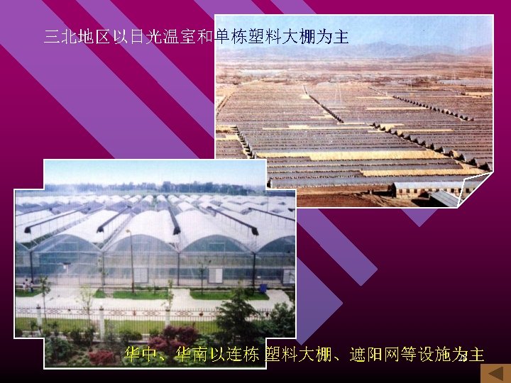 Present condition Plastic tunnel 塑料拱棚 Chinese Solar greenhouse 日光温室 装配式钢管骨架大棚 竹木结构大棚 Glass (Plastic) house 现代化连栋温室 Shading and Rainproof cover降温防雨设施 19
