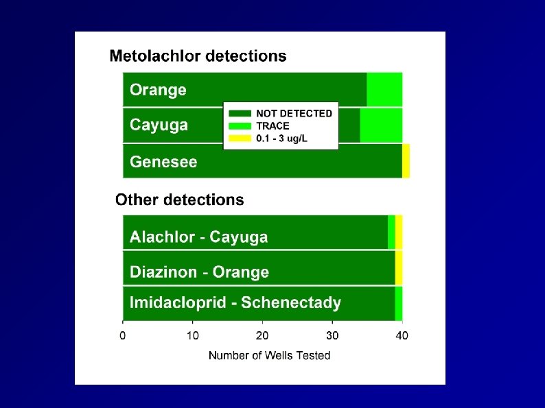 Findings in six counties. . . DEC broad-based scans: One detection of one active ingredient in 240 samples (reporting limits 1 μg/L (1 ppb) or less). Degradation products detected in 5 of 41 wells tested in Wayne County No exceedance of any of 15 NYS ground water standards or guidance levels