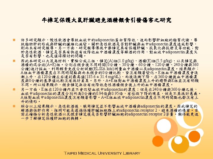Protective effect of Antrodia camphorata on liver from injury of alcohol feeding in rat n n n Several studies found that chronic ethanol intake decreased circulating adiponectin level, disrupted lipid metabolism in hepatocytes, and caused excessive lipid accumulation with the development of fatty liver and hepatic steatosis. However, the effects of acute ethanol feeding on circulating adiponectin level and liver have not been examined. Besides, Antrodia camphorate, a traditional Chinese medicine, was found to exert hepatoprotective, anti-oxidative and anti-inflammation effects. In this study, we examined the role of Antrodia camphorata in circulating ethanol and adponectin levels upon acute ethanol feeding in rats. Rats were divided into three groups: one group was Antrodia camphorata (1. 0 g/kg) feeding, another group was ethanol (5. 5 g/kg) feeding, and the other group was fed with the mixture of Antrodia camphorata and alcohol. Blood sample was collected and assayed by ELISA kits at indicated time points. The results showed that Antrodia camphorata feeding did not affect the circulating ethanol levels. After acute alcohol intake, the serum ethanol levels were significantly increased to the maximum value at 120 minutes (185. 6 ± 31. 4 mg/d. L) and then decreased to the basal level (94. 2 ± 23. 6 mg/d. L) at 360 minutes in ethanol-fed rats. Furthermore, the circulating ethanol levels in mixture-fed rats were similar to those in ethanol-fed rats at each indicated time points. Therefore, Antrodia camphorata administration did not attenuate acute ethanol feeding-induced elevation of serum ethanol levels. On the other hand, there was no effect of alcohol feeding on serum adiponectin levels during 120 minutes. Adiponectin levels were increased to 1. 16 -fold and 1. 15 -fold at 240 minutes and 360 minutes, respectively. However, there was no significant difference compared with 0 minute group. Given the mixture of Antrodia camphorata and alcohol or Antrodia camphorata alone did not significantly affect adiponectin serum level. These results suggested that Antrodia camphorata intake did not suppress serum ethanol or adiponectin levels in ethanol-fed rats. We proposed that the hepatoprotective effect of Antrodia camphorata might be due to protect the adiponectin receptor 2 (Adipo R 2) on cell membrane of hepatocyte from ethanol injury. It is important to examine the Adipo R 2 content in ethanol-fed and in Antrodia camphorate-fed groups. Furthermore, the mechanism of hepatoprotective effect of Antrodia camphorate could be explored.