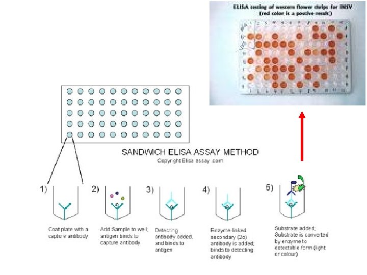ELISA Yöntemi • “ELISA plate” antikor ile kaplanır. Antijen miktarı belirlenecek olan örnek kuyulara yüklenir. Antijen ile antikorun bağlanması beklenir. • Bağlanmamış veya özgün olmayan proteinler yıkama ile uzaklaştırılır. • Enzim bağlı ikincil antikorlar eklenir ve bunlarda antijen-antikor yapısına bağlanır (sandviç yapısı). • Enzimle etkileşecek substrat eklenerek oluşan ışıma ile protein miktarı spektrofotometrik olarak ölçülür.