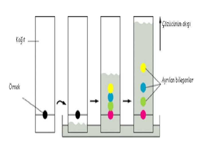 Kromatografik Yöntemler İnce Tabaka Kromatografisi • Proteinlerin çözünme yeteneklerine göre ayrışım yapılır. • Katı bir yüzeye (selüloz) emdirilen örnek çözücü yüzey içine yerleştirilir. Çözücü solüsyonun yüzeyde ilerlemesiyle, örnekteki proteinler çözünme yeteneklerine göre ayrılırlar.