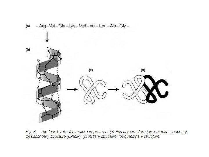 Struktur protein Dapat dibedakan dalam empat aras (level). • Struktur primer menyatakan susunan linear asam-asam amino sepanjang rantai polipeptida. • Struktur sekunder menggambarkan pola pelipatan (folding) bagian polipeptida ke dalam struktur yang teratur, misalnya heliks dan lembaran terlipat-β (β pleated sheet). • Struktur tersier menggambarkan pelipatan bagian-bagian antara heliks-α dan lembaran- β serta semua interaksi nonkovalen yang menyebabkan terjadinya pelipatan yang sesuai pada suatu rantai polipeptida. lnteraksi nonkovalen tersebut antara lain ikatan hidrogen, ikatan hidrofobik, dan interaksi van der Waals. • Struktur kuaterner, menunjukkan interaksi nonkovalen yang mengikat beberapa rantai polipeptida ke dalam satu molekul tunggal protein, misalnya hemoglobin.