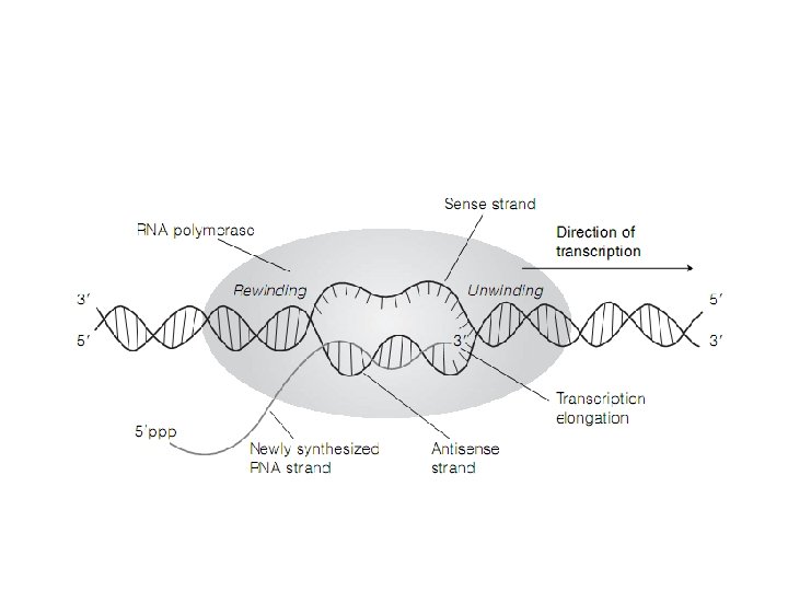 Mekanisme dasar transkripsi • 1. 2. 3. 4. Transkripsi (sintesis RNA) dilakukan melalui beberapa tahapan yaitu: Faktor-faktor yang mentendalikan transkripsi menempel pada bagian promoter. Penempelan faktor-faktor pengendali transkripsi menyebabkan terbentuknya kompleks promoter yang terbuka (open promoter complex). RNA pofimerase membaca cetakan (DNA template) dan mulai melakukan pengikatan nukleotida yang komplementer dengan cetakannya. Setelah terjadi proses pemanjangan untaian RNA hasil sintesis, selanjutnya diikuti dengan proses pengakhiran (terminasi) transkripsi yang ditandai dengan pelepasan RNA polimerase dari DNA yang ditranskripsi