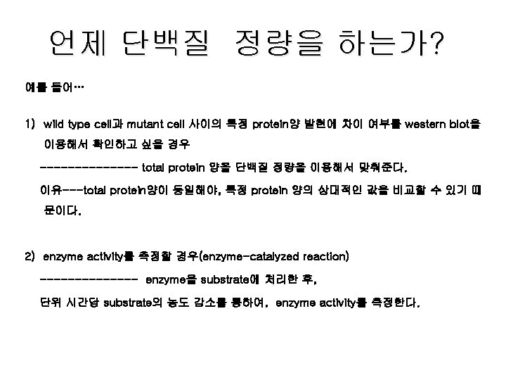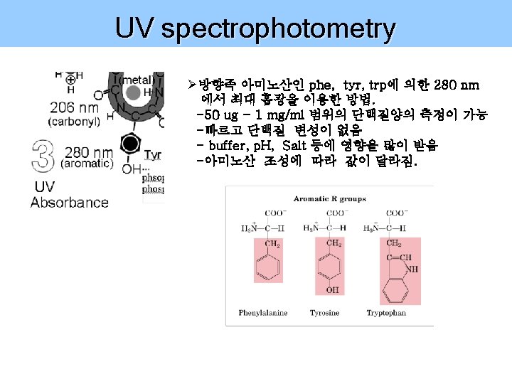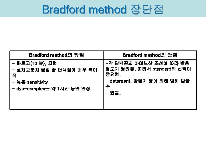 Bradford method Ø Coomassie Brilliant Blue G-250(CBBG)가 (lys, arg), (trp, tyr, his, phe)에 결합시의 흡광도의 변화를 측정 CBBG가 free dye의 형태로 있을 때 최대 흡광은 465 nm (red) 이지만, amino acid와 결합하여 anionic form일 때의 최대 흡광은 595 nm (blue) 인 특징을 이용. free dye(cationic) bound dye(anionic) Red <ㅡ> Green <ㅡ> Blue <ㅡ> Blue-Protein (470 nm) (650 nm) (590 nm) (595 nm) H+ http: //images. google. co. kr/imgres? imgurl=http: //www. medicine. mcgill. ca/physio/vlab/Other_exps/endo/images/coomassie. gif&imgrefurl=http: //www. medicine. mcgill. ca/physio/v lab/Other_exps/endo/spectro. htm&usg=__o. Xkz. OZQq. WGGM_Kk. W 3 r. EZ 8_v. RKc=&h=280&w=472&sz=31&hl=en&start=1&um=1&itbs=1&tbnid=1 N 1 qx. G 3 gt 1 plo. M: &tbnh=77&tbnw=129&prev=/images%3 Fq%3 Ddouble%2 Bprotona ted%2 Bcoomasie%2 Bbriliant%2 Bblue%2 Bbradford%26 um%3 D 1%26 hl%3 Den%26 newwindow%3 D 1%26 tbs%3 Disch: 1