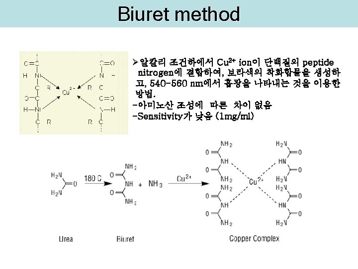 Lowry method 1 단계 : Biuret reaction : 알칼리 용액에서 Cu 2+와 protein peptide bond 간에 complex를 형성시켜서 Cu 2+가 Cu+로 환원된다. 2 단계 : Folin-Ciocalteu reaction : Cu+와 tryptophan, tyrosine, cysteine의 radical group이 Folin-Ciocalteu reagent (phosphomolybdate and phosphotungstate complex (노란색)를 환원시켜서 진한 청색으로 변한다. (yellow deep blue) 노란색 protein 500~
