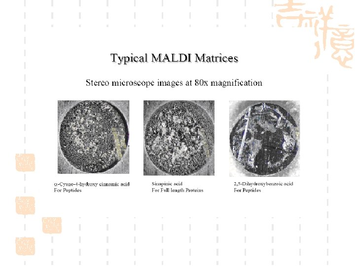 Ø Dissolve the peptide mixture in 0. 1%TFA. Ø Desalt by Zip. Tip C 18 microcolumn (optional). Ø Directly elute the peptide mixture with -cyano-4 -hydroxy cinnamic acid (CHCA) in 70% acetonitrile and spot the peptide mixture on sample plate. Ø The peptide mixtures cocrystallize with matrix on sample plate