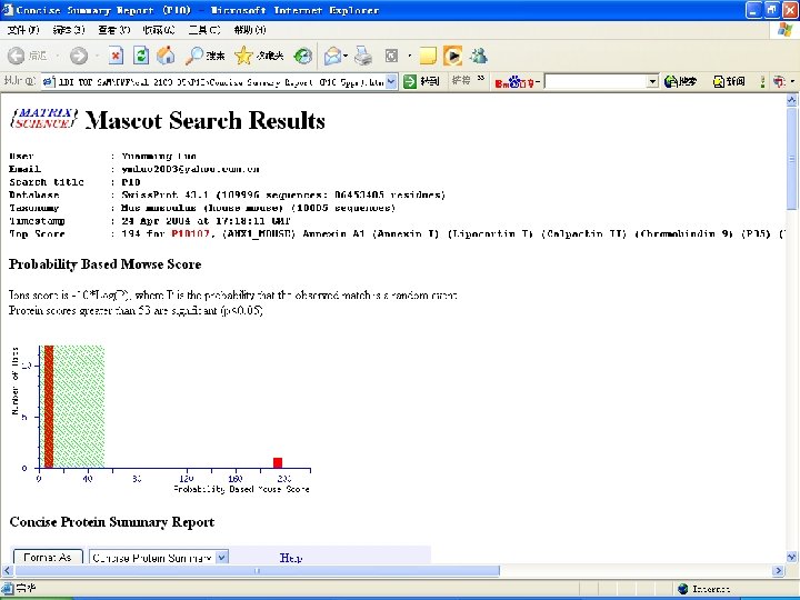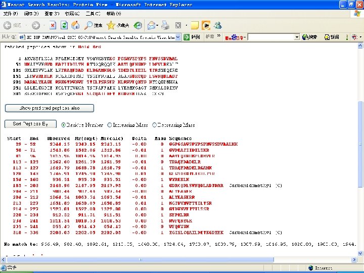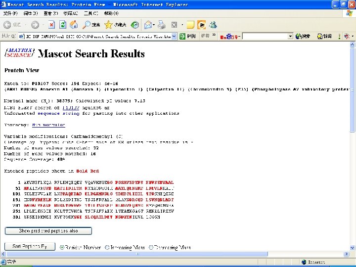 Mass list of annexin I (monoisotope) Ø 855. 433556 Ø 908. 444342 Ø 912. 518921 Ø 936. 511625 Ø 966. 487904 Ø 982. 482524 Ø 1011. 539929 Ø 1064. 543038 Ø 1092. 608231 Ø 1213. 550297 Ø 1262. 595173 Ø 1523. 808451 Ø 1543. 863778 Ø 1640. 800435 Ø 1649. 789297 Ø 1651. 894876 Ø 1724. 838185 Ø Ø Ø Ø 1746. 906727 1768. 874981 1803. 789401 1807. 994050 1815. 963445 1816. 950528 1820. 832451 1903. 003019 1944. 068873 1945. 050987 2132. 706314 2148. 959052 2163. 051584 2203. 054533 2344. 153915 2722. 314675