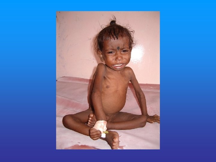 MARASMUS • Severe wasting of muscle & s/c fats • Severe growth retardation • No edema or hair changes or fatty liver • Alert but miserable • Hungry