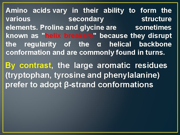 Amino acids vary in their ability to form the various secondary structure elements. Proline and glycine are sometimes known as "helix breakers" because they disrupt the regularity of the α helical backbone conformation and are commonly found in turns. By contrast, the large aromatic residues (tryptophan, tyrosine and phenylalanine) prefer to adopt β-strand conformations