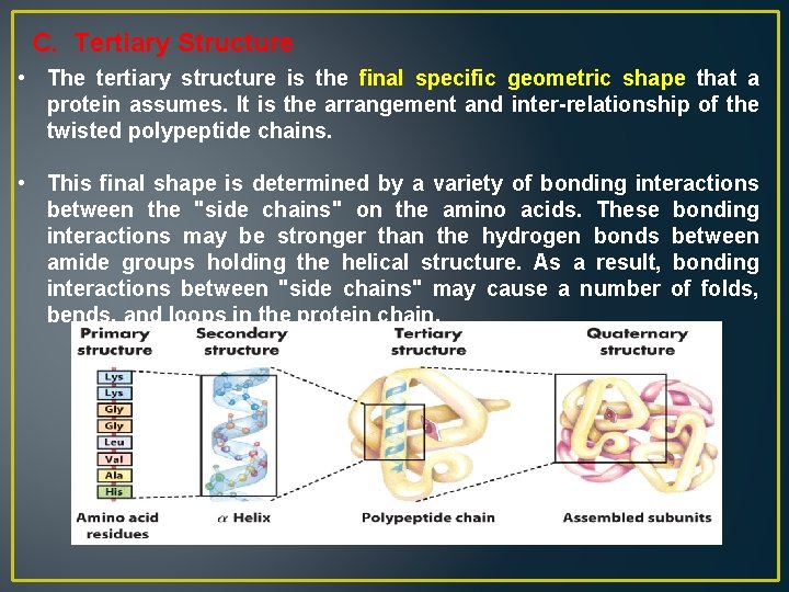 C. Tertiary Structure • The tertiary structure is the final specific geometric shape that a protein assumes. It is the arrangement and inter-relationship of the twisted polypeptide chains. • This final shape is determined by a variety of bonding interactions between the "side chains" on the amino acids. These bonding interactions may be stronger than the hydrogen bonds between amide groups holding the helical structure. As a result, bonding interactions between "side chains" may cause a number of folds, bends, and loops in the protein chain.