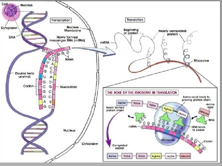 Translation -- The decoding of m. RNA into a protein Nuclear envelope Amino acid t. RNA Polypeptide chain Cell membrane