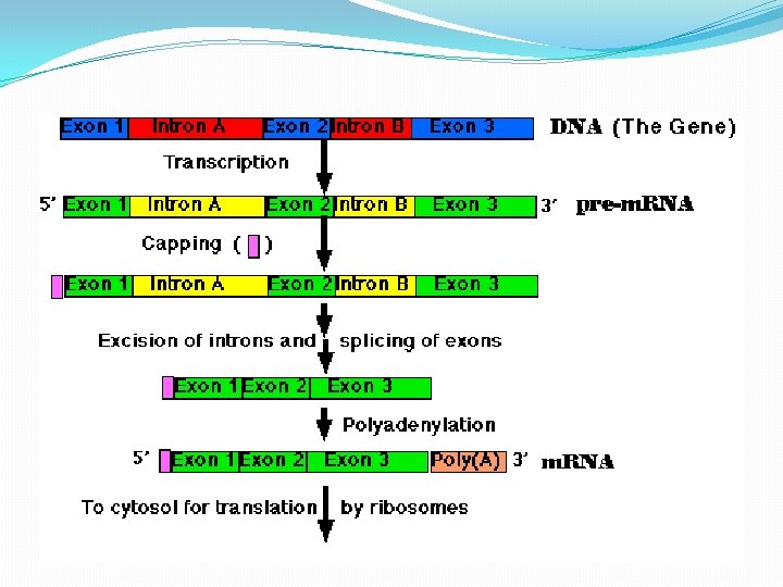 Poly-A tail � 3’ end of transcript gets a poly-A tail added to it �Enzyme adds 50 -250 more A ribonucleotides �More As added make the m. RNA last longer �Fewer As make the m. RNA break down quicker �Breakdown starts immediately on entry to cytosol