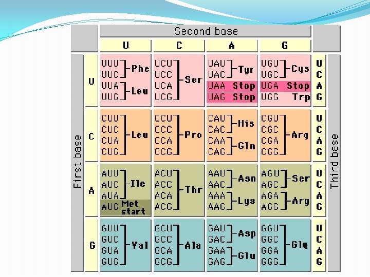wobble effect �The last base in the anti-codon has some flexibility in what it binds to (wobble room) �So anticodon AGU could bind to UCA or UCG