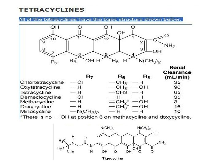 • Minocycline – eradicate the meningococcal carrier state • Demeclocycline – inhibits the action of antidiuretic hormone in the renal • Tigecycline – Staphylococcus aureus, MRSA, VRSA – enterococci, including vancomycinresistant strains – Proteus and P aeruginosa, however, are