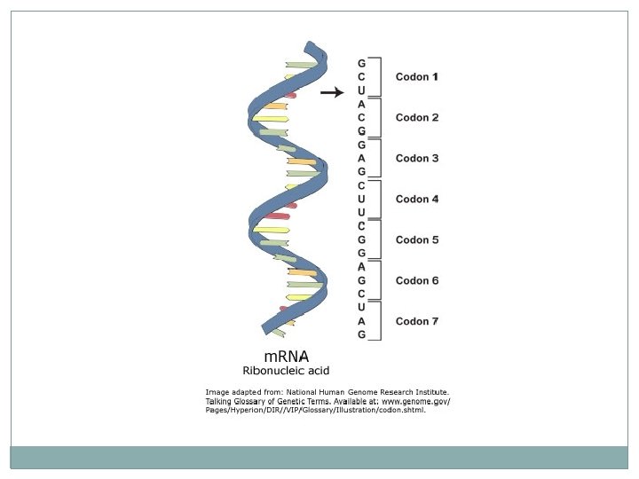GENETIC CODE The “language” that translates the sequence of nitrogen bases in DNA (m. RNA) into the amino acids of a protein. Codon = three nucleotides on DNA or m. RNA One codon specifies one amino acid Some codons are redundant (code for the same amino acid) The genetic code is universal to all organisms