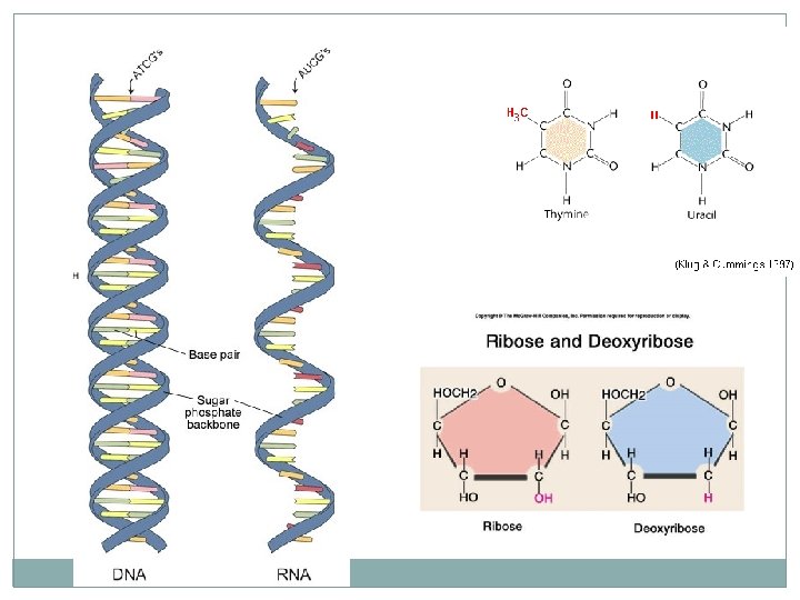 RNA STRUCTURE Differs from DNA in three ways. 1. Single strand of nucleotides instead of double stranded 2. Has uracil instead of thymine 3. Contains ribose instead of deoxyribose