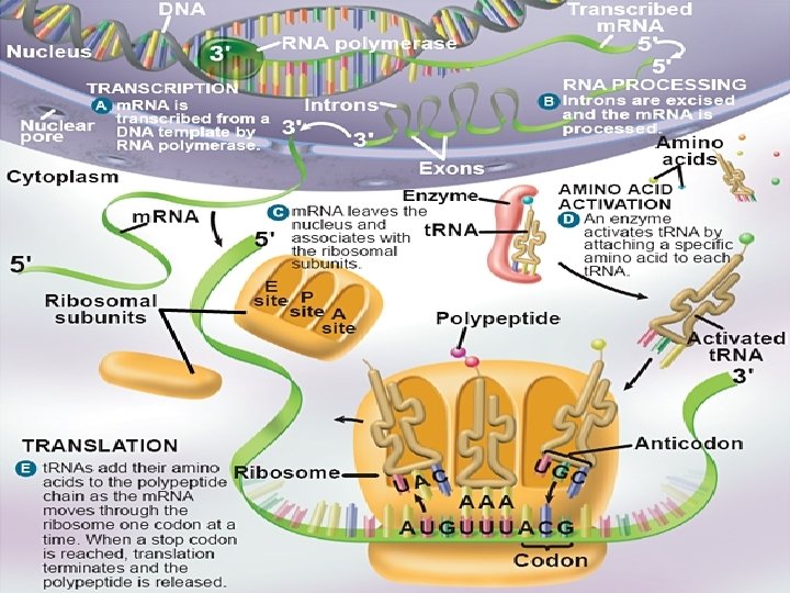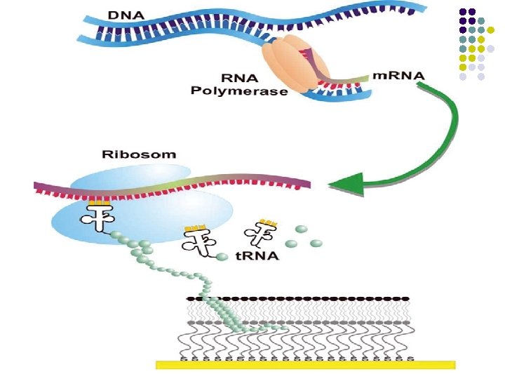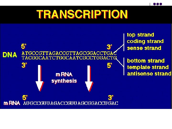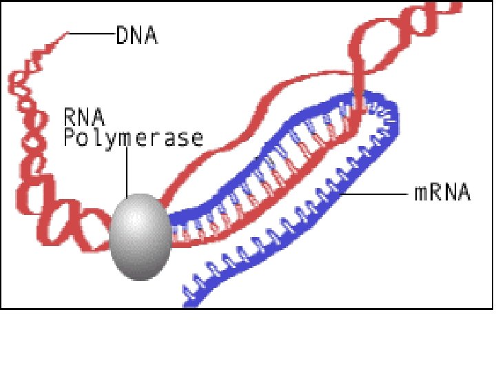 Molecular Genetics DNA, RNA, and Protein Transcription § Through transcription, the DNA code is transferred to m. RNA in the nucleus. § DNA is unzipped in the nucleus and RNA polymerase binds to a specific section where an m. RNA will be synthesized.