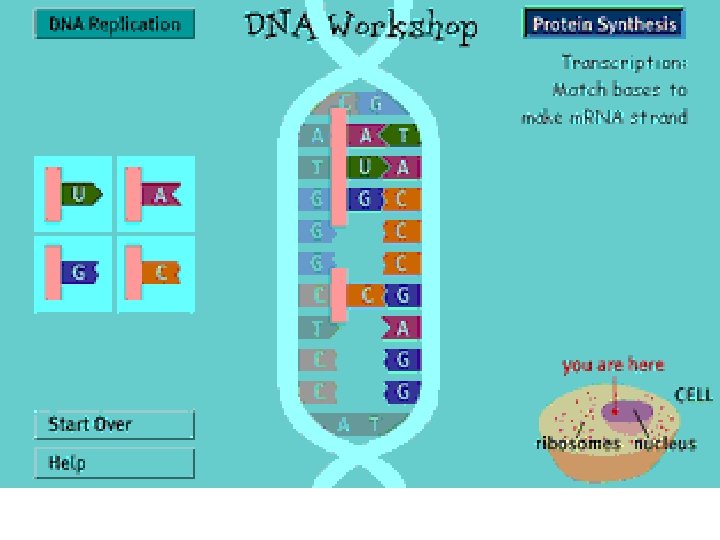 How RNA makes Proteins 1. 2. 3. 4. DNA unzips and m. RNA reads the DNA strand. m. RNA carries the DNA code to the ribosome in the cytoplasm The ribosome reads the m. RNA codon and pairs it with t. RNA and the associated amino acid. The amino acids are strung together to form a chain which then becomes a protein