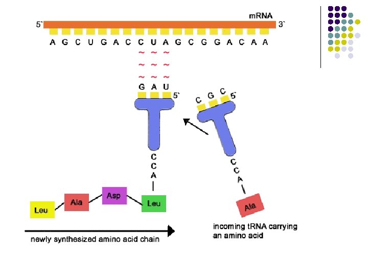 Molecular Genetics DNA, RNA, and Protein Translation § In translation, t. RNA molecules act as the interpreters of the m. RNA codon sequence. § At the middle of the folded strand, there is a threebase coding sequence called the anticodon. § Each anticodon is complementary to a codon on the m. RNA.