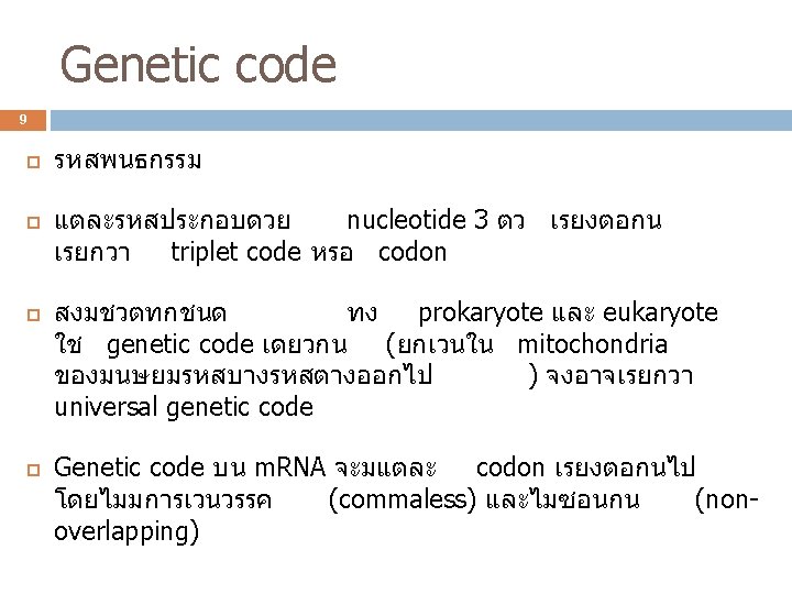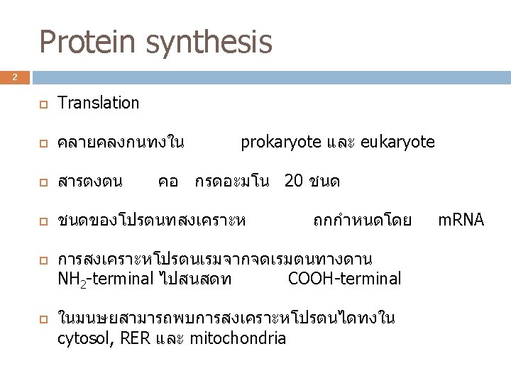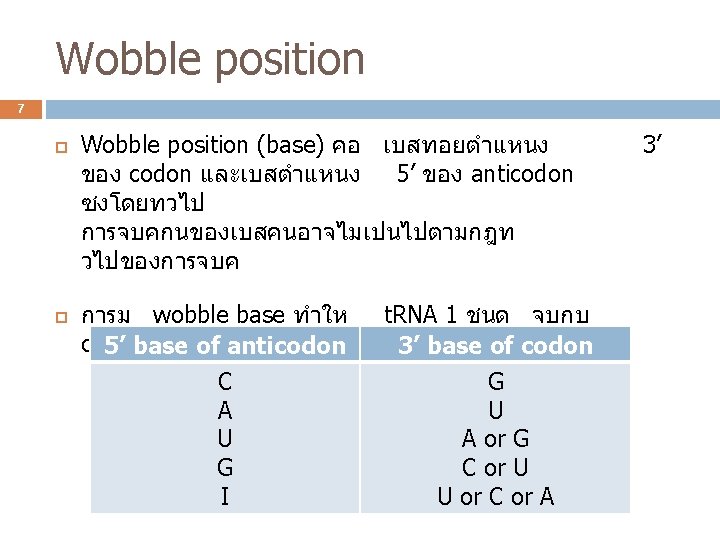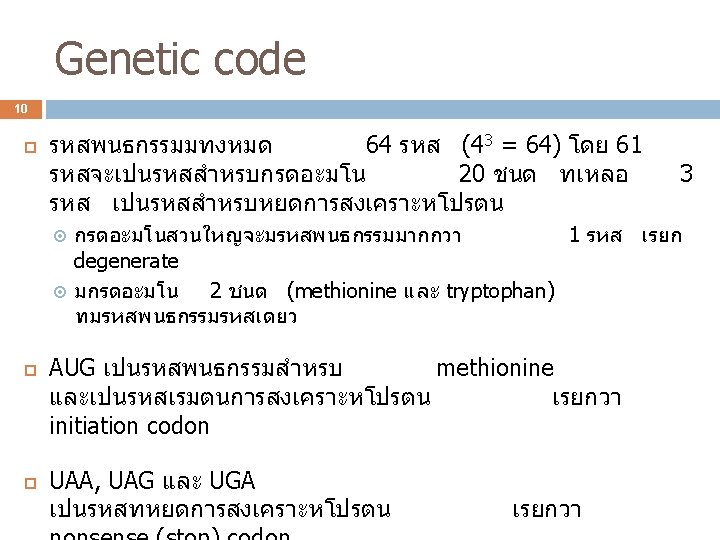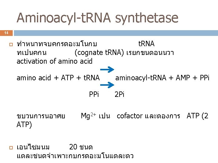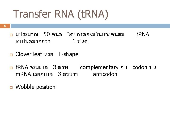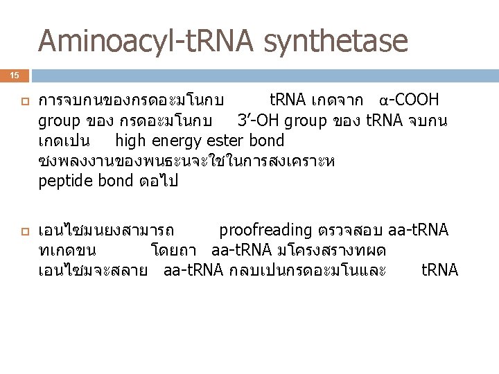 3 ปจจยทใชในการสงเคราะ หโปรตน L-amino acid t-RNA Genetic code Aminoacyl-t. RNA synthetase ribosome