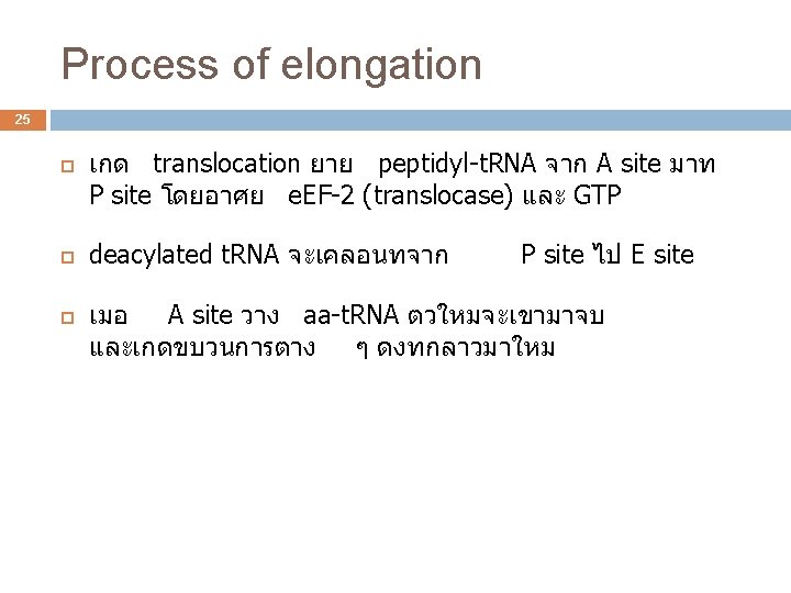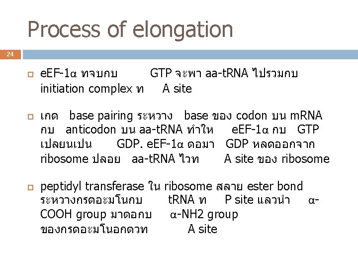 Elongation 23 เกดขนหลงการเกด initiation complex ribosome จะตอสาย peptide ใหยาวขนโดยการอาน codon บน m. RNA ไปเรอย ๆ จนถง termination codon ปจจยทใช คอ initiation complex aminoacyl-t. RNA ทรวมกบ elongation factors (EF) GTP e. EF 1α และ GTP เปน complex