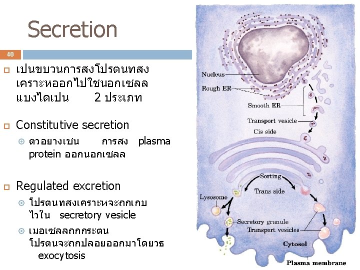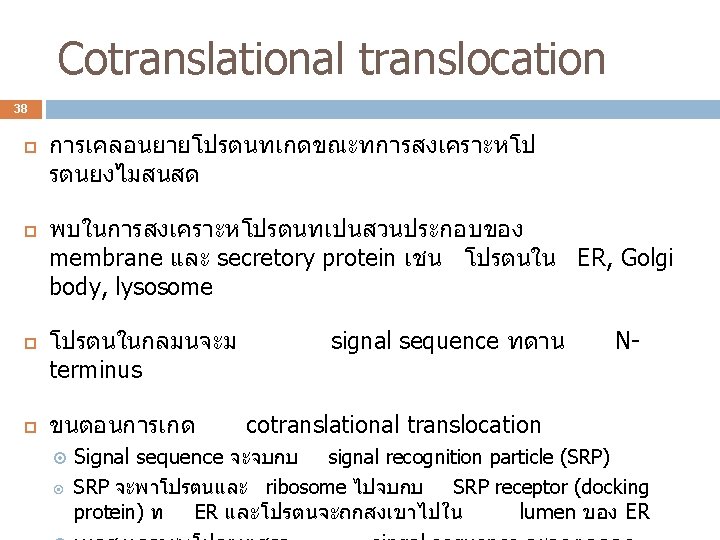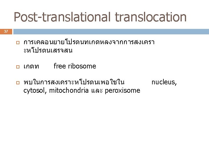 Protein translocation (protein targeting) 36 การเคลอนยายโปรตนจากบรเวณทสงเคราะหไปย งบรเวณทโปรตนทำงาน แบงไดเปน 2 กลม 1. Post-translational translocation 2. Cotranslational translocation