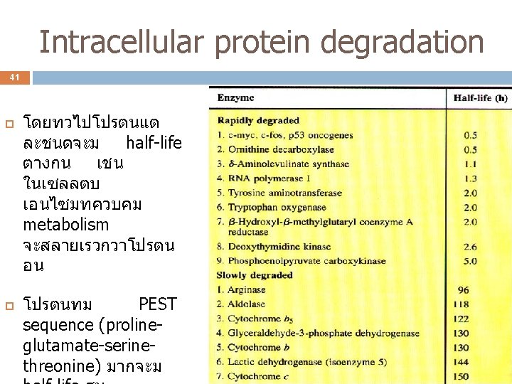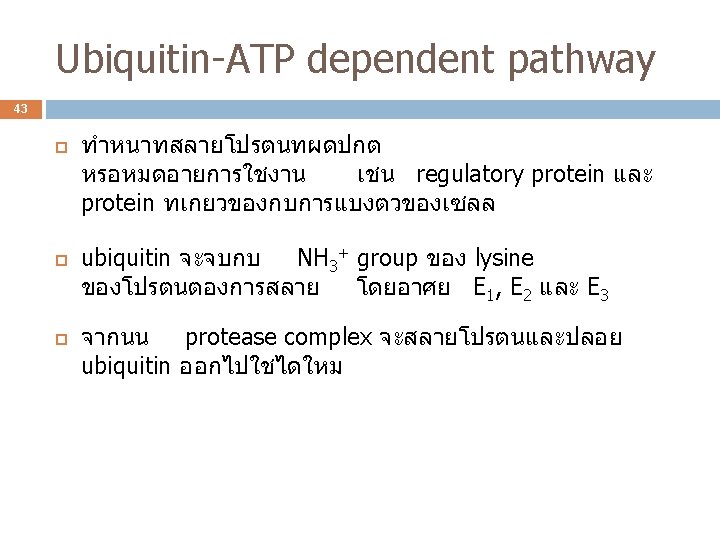Intracellular protein degradation 42 การสลายโปรตนในเซลล ATP dependent proteolysis เกดขนใน โดยอาศยโปรตน ubiquitin proteasomes Lysosome degradation Other proteolytic systems - Apoptosis หรอทเรยกวา programmed cell death อาศยเอนไซม caspases - Calcium-dependent thiol proteases ทเรยกวา calpains