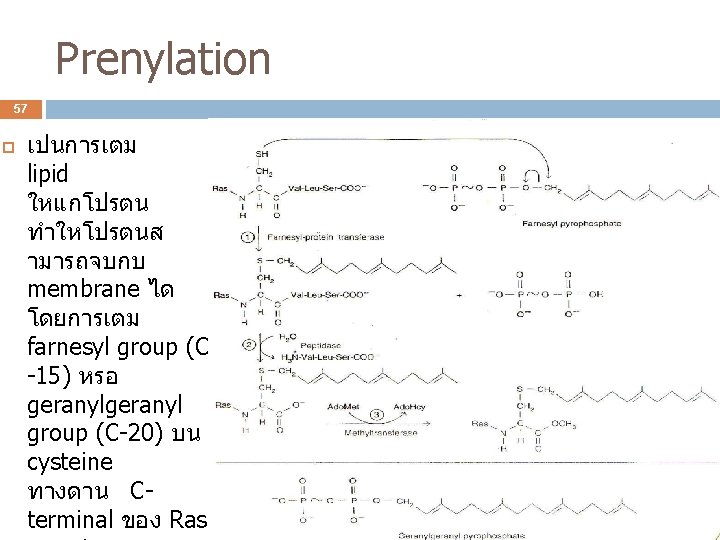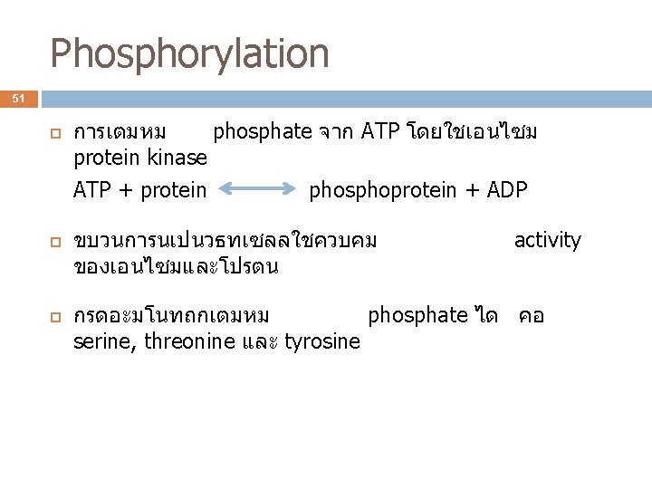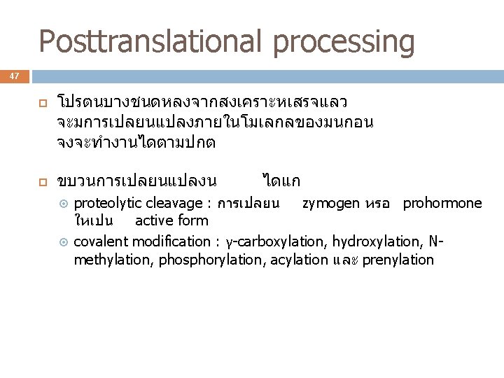 Proteolytic cleavage 48 การเปลยน zymogen เปน enzyme ทออกฤทธได trypsinogen trypsin factor XII การเปลยน proinsulin factor XIIa prohormone เปน hormone insulin pro-opiomelanocortin (POMC) ACTH + MSH + β-endorphin