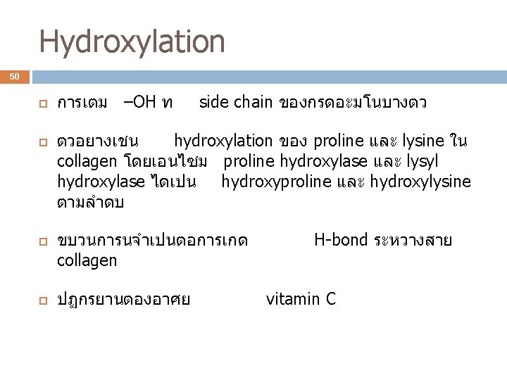Biosynthesis of collagen 63 Posttranslational modification Signal sequence จะถกตดออกจาก pro -chain prepro -chain กลายเปน Hydroxylation of prolyl and lysyl residues : เกดเปน hydroxy proline (สำคญตอ thermal stability) และ hydroxylysine (สำคญตอ tissue tensile strength) ขนตอนนใช vitamin C (ascorbate) เปน coenzyme O-linked glycosylation : เปนการเตม hydroxy lysine galactose หรอ glucose ใน N-linked glycosylation : เปนการเตม C-terminal ของ pro -chain mannose-rich CHO ท