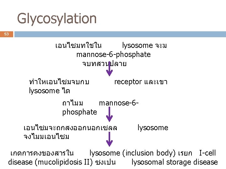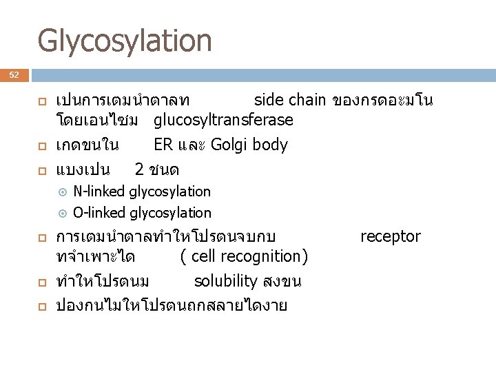 N-linked glycosylation 54 เปนการเตม asparagine dolichol phosphate บน amide group ของ เกดท membrane ของ ER มผลตอการเกด protein folding ถกยบยงดวย bacitracin และ tunicamycin