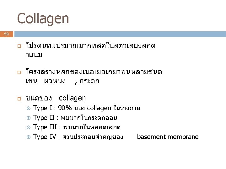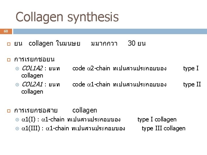 Collagen synthesis 61 Collagen fibril ประกอบดวย monomer คอ tropocollagen หลายโมเลกลทเชอมกนโดยการเกด cross-link Tropocollagen แตละโมเลกลประกอบดวย สาย พนกนเปน triple helix -chain 3 ชนดของ -chain ใน collagen type ตางๆ Type I : 1(I)-chain 2 สาย และ 2(I)-chain 1 สาย Type II : 1(II)-chain 3 สาย (homotrimer) Type III : 1(III)-chain 3 สาย (homotrimer)