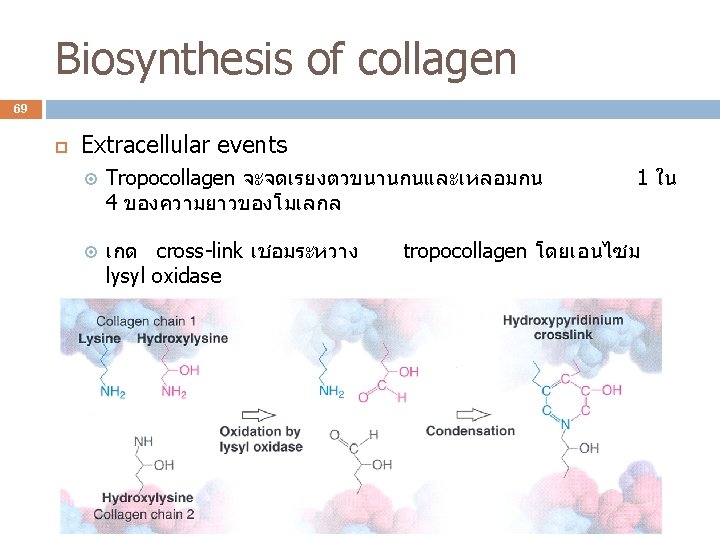 Biosynthesis of collagen 68 Posttranslational modification Modification beyond RER : procollagen ถกสงไปยง และสงออกจากเซลลในรปของ secretory vesicle Golgi body Extracellular events amino-terminal propeptide และ carboxyl terminal propeptide จะถกตดออกโดย procollagen N-protease และ procollagen Cprotease ตามลำดบ เรยกโมเลกลทไดวา tropocollagen ซงมความสามารถในการละลายลดลง 100 เทา