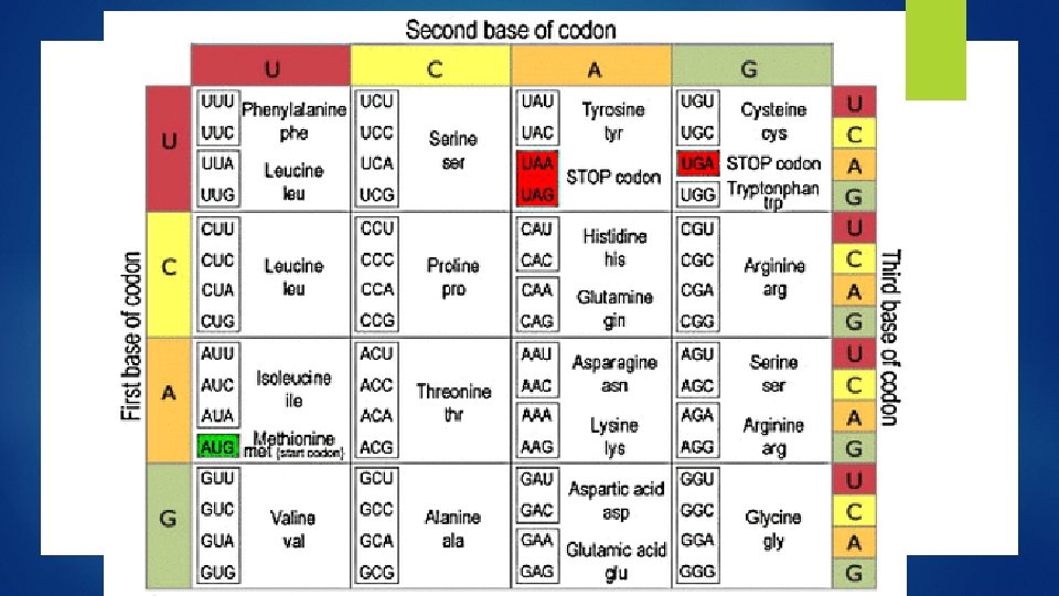Codon 1 codon = 1 amino acid A sequence of three nucleotides = 1 codon 64 different codon triplets 61 code for amino acids, 3 stop codons