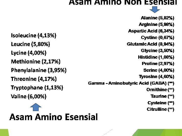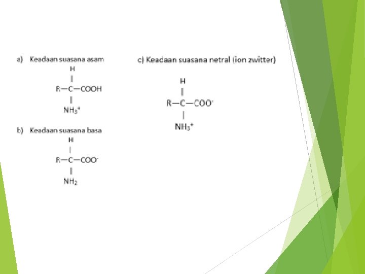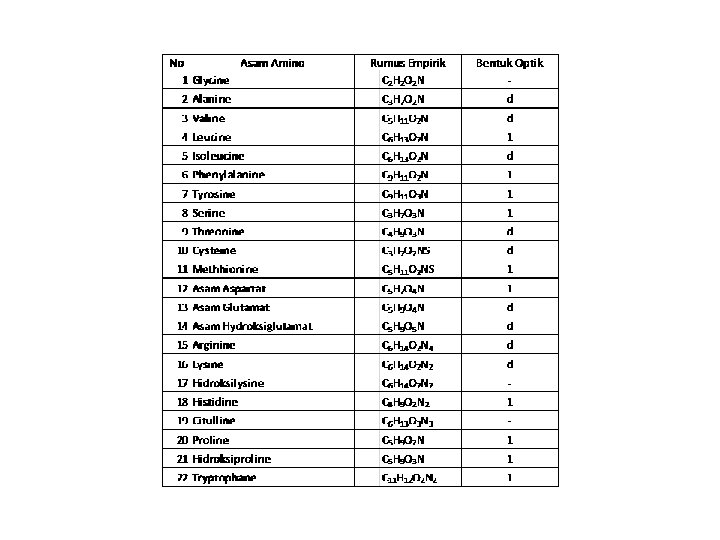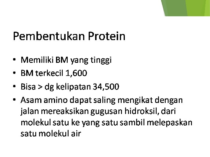 Protein merupakan molekul yang sangat besar atau makrobiopolimer yang tersusun dari monomer yang disebut asam amino. Ketika asam amino bergabung, mereka membentuk ikatan khusus yang disebut ikatan peptida melalui sintesis dehidrasi, dan menjadi polipeptida atau protein. Molekul protein mengandung karbon, hidrogen, oksigen, nitrogen dan kadang kala sulfur serta fosfor. SIFAT ASAM AMINO: 1. Amfoter (dapat bersifat asam dan basa) 2. Optis-Aktif 3. Zwitter ion 4. Berpolimerisasi membentuk PROTEIN
