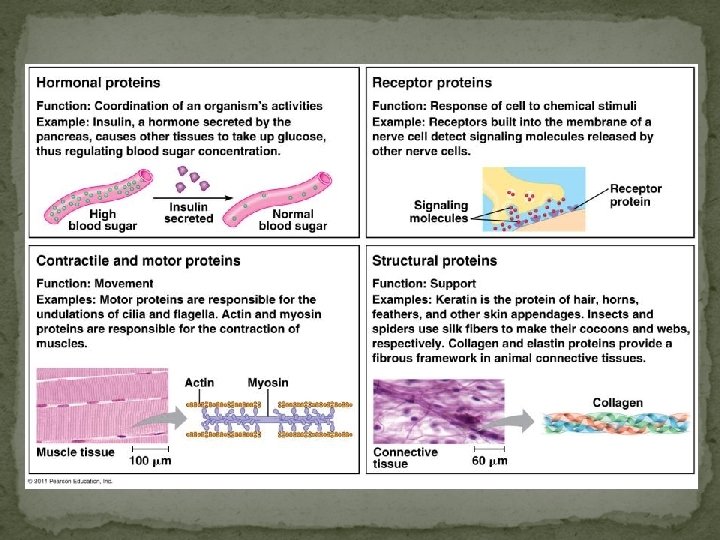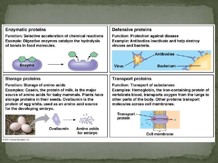 Proteins Most structurally & functionally diverse group Function: involved in almost everything that goes on in a living thing! (50% dry mass of cells enzymes (pepsin, DNA polymerase) structure (keratin, collagen) carriers & transport (hemoglobin, aquaporin) cell communication signals (insulin & other hormones) receptors defense (antibodies) movement (actin & myosin) storage (bean seed proteins)